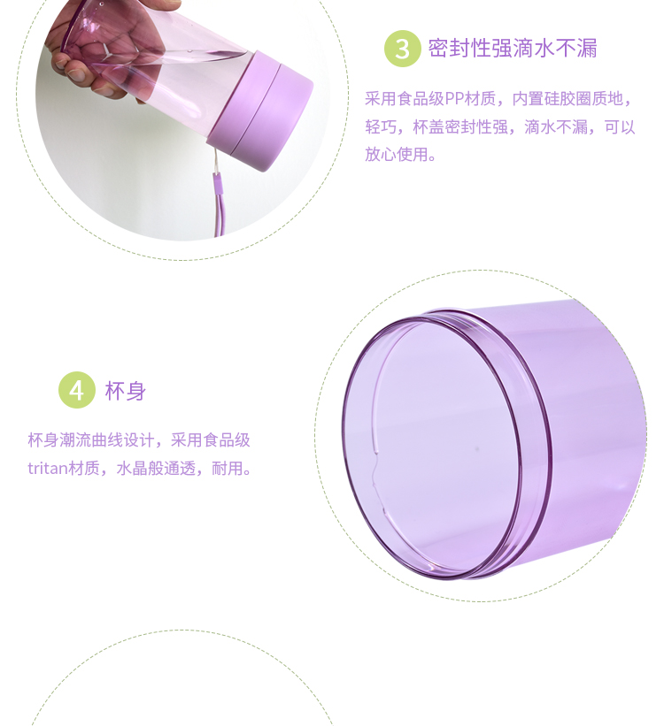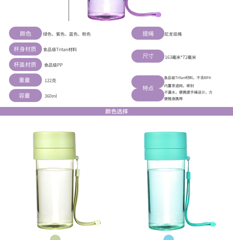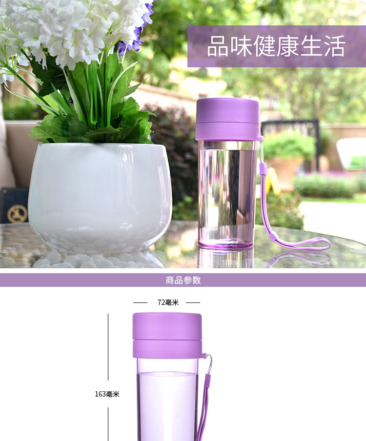 塑料杯子防漏 學生水杯帶茶隔 運動水杯trian材質 隨身杯帶提繩360ml
